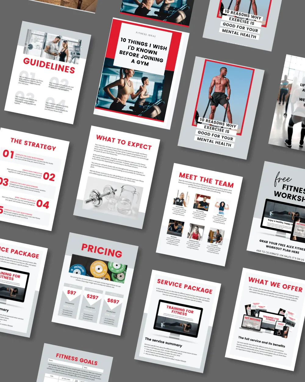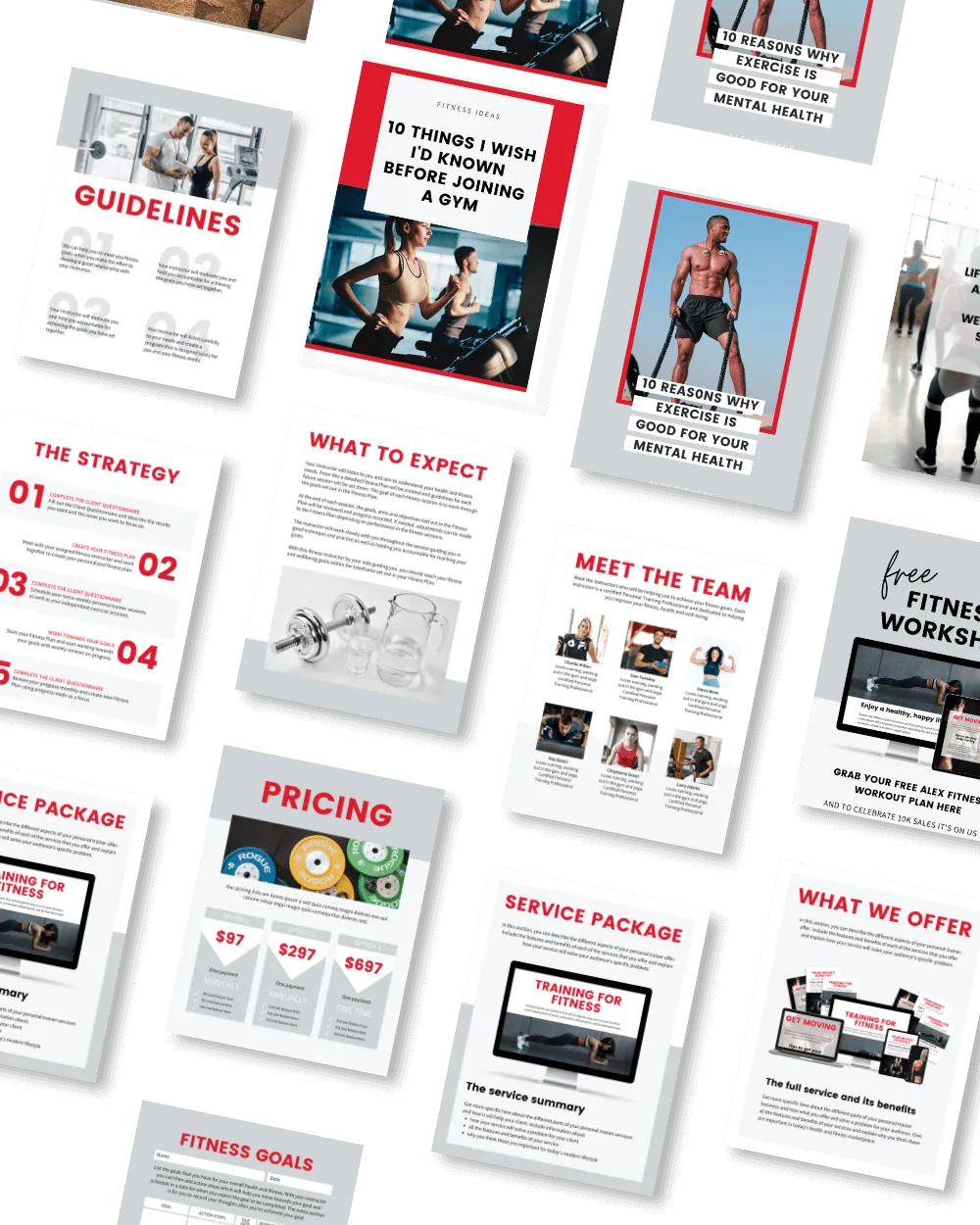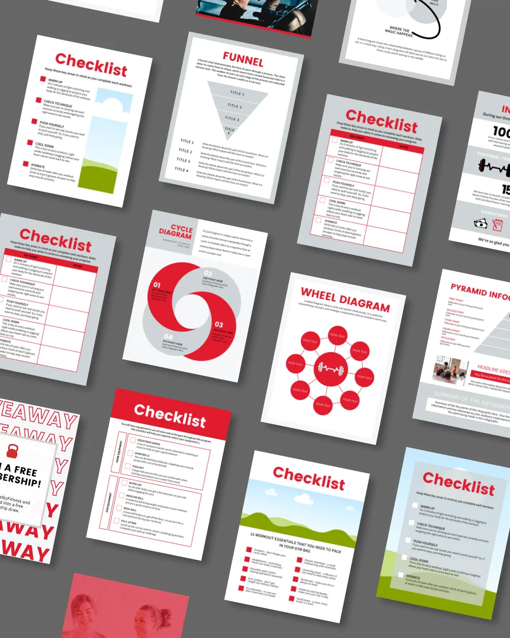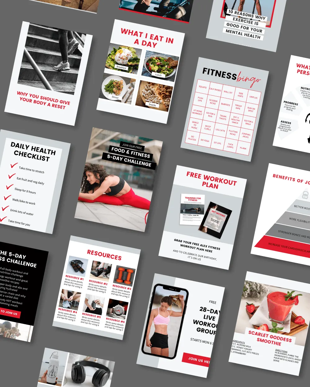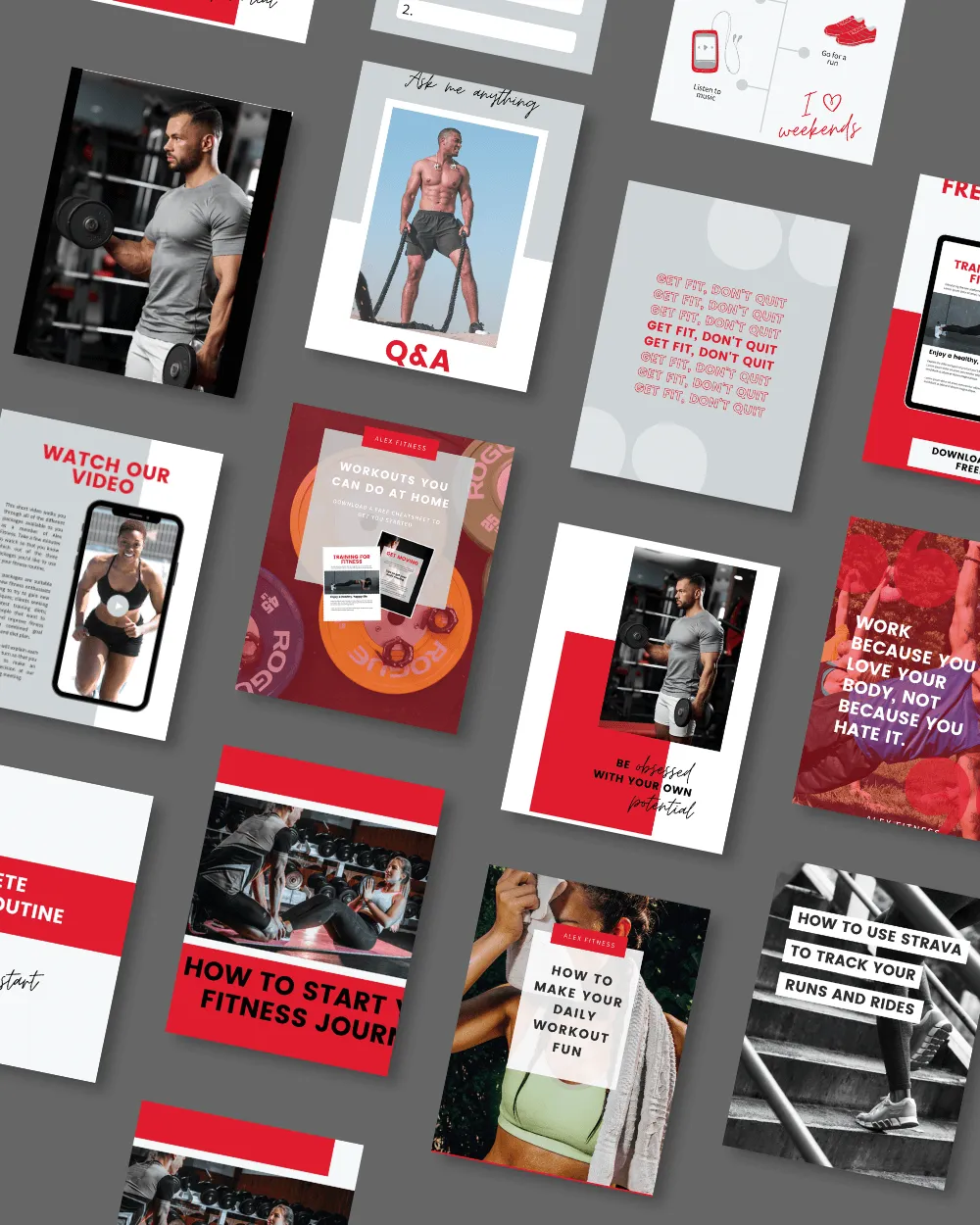 Featuring themes like workouts, diet tips, inspiration, and more, these customizable templates let you effortlessly add your brand’s colors, logos, and motivational quotes.